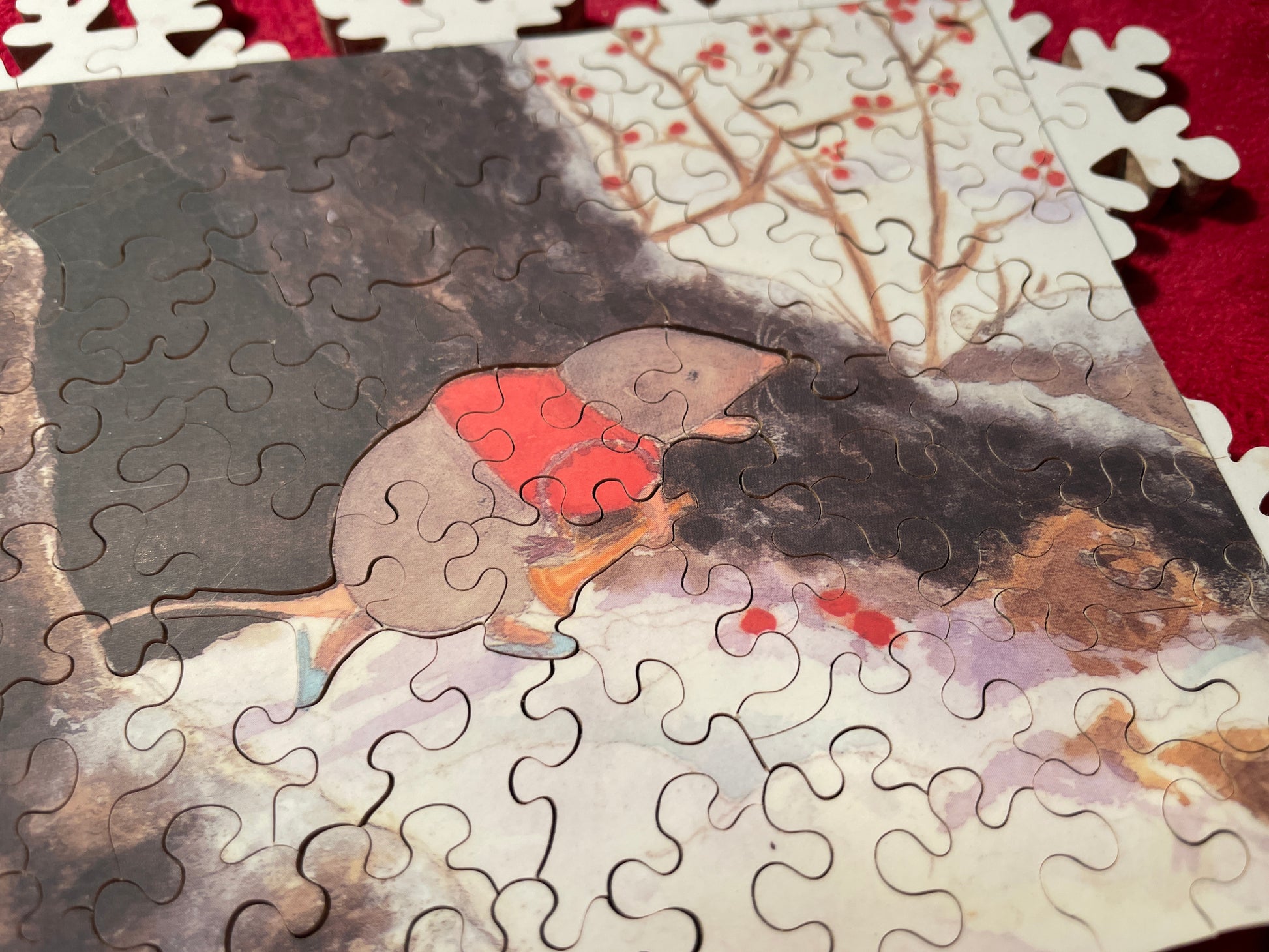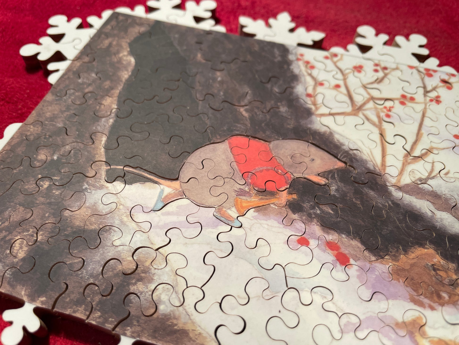 Puzzle pieces are shipped in a handmade bag, in a box, along with the tray on the side.