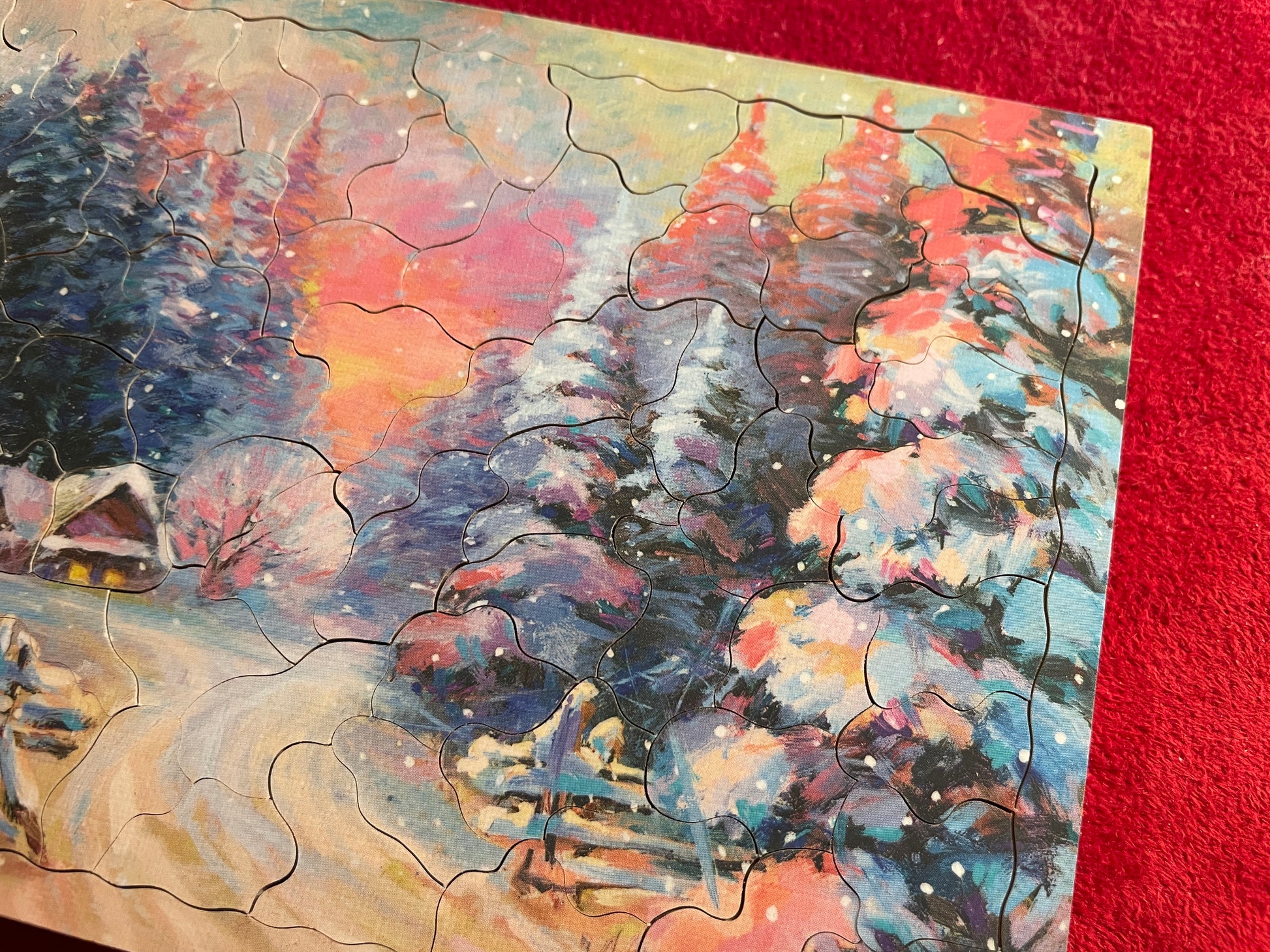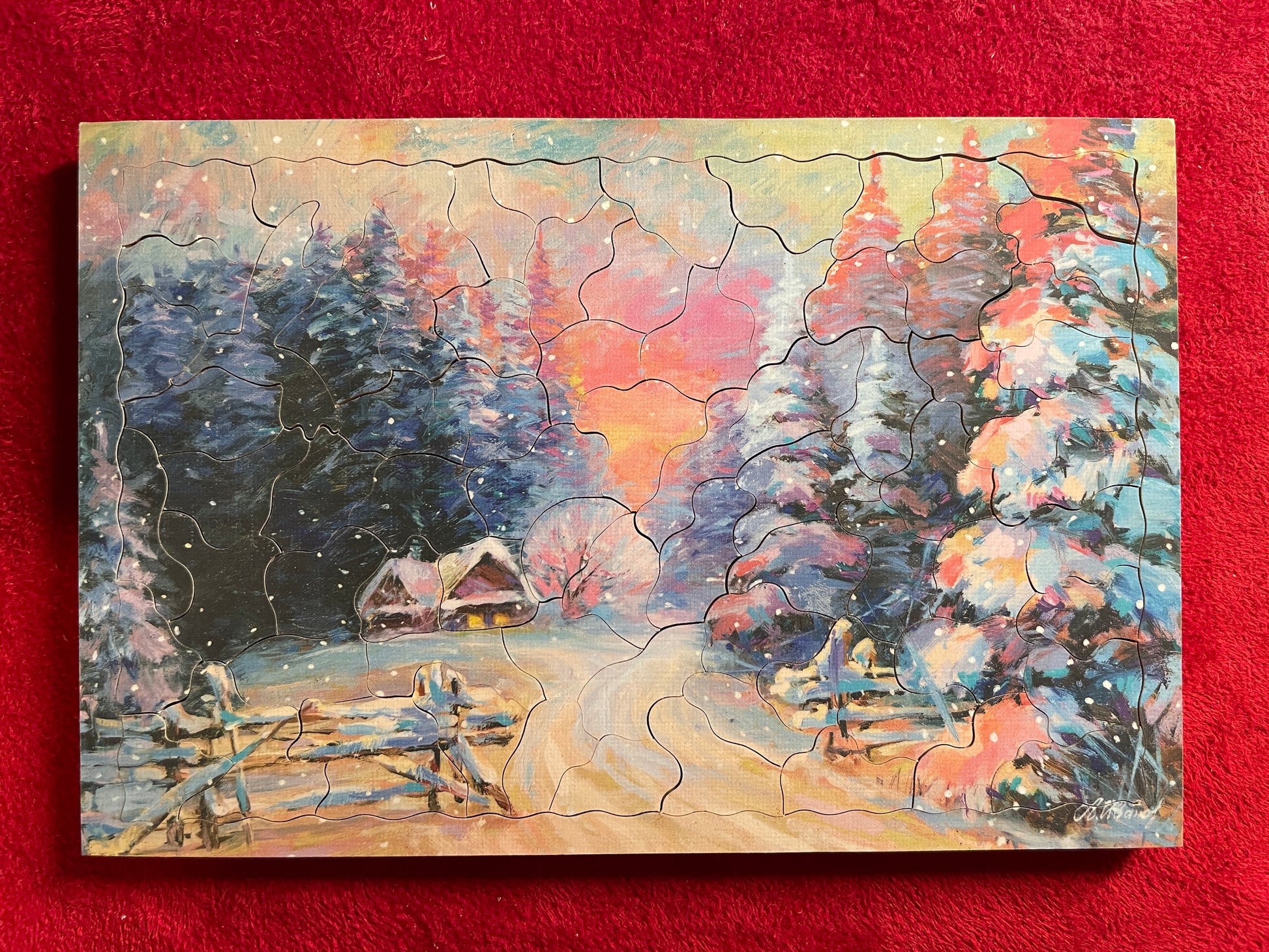 Puzzle pieces are shipped in a handmade bag, in a box, along with the tray on the side.